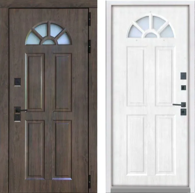Цвет металла: снаружи черная, изнутри - белая шагрень. Внешняя отделка: МДФ панель 16 мм влагостойкая, винорит Алмон 28. + Декоративные МДФ наличники.