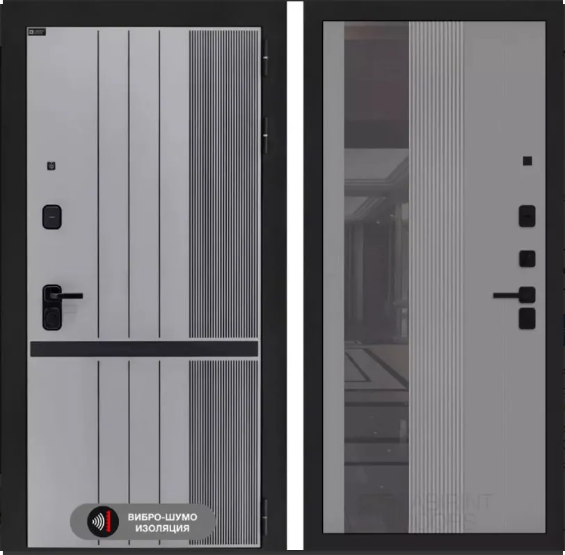 Покраска металла: Муар черный Фрезерованная МДФ панель 10 мм, цвет "Velutto Grigio" с патиной и вставкой из металла в цвет наличника (заподлицо)